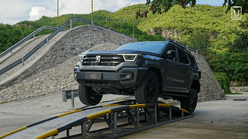 汽油动力的坦克400拥有更轻的整车重量,搭配33°接近角、31°离去角与22.5°纵向通过角的领先越野能力,使得整车拥有更强的通过性与极限越野能力。