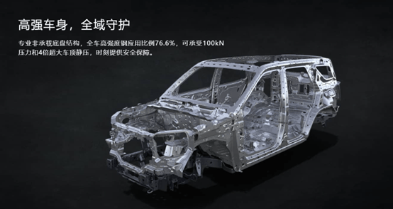 坦克400汽油版,以其坚固的非承载式车身和超高强度钢材,构筑起坚不可摧的安全防线。整体扭转刚度高达290KN•m/rad,为车辆提供坚如磐石的稳定性。高强度车身设计,应用大量热成型超高强钢,构建起六纵七横的桁架结构,全车高强度钢使用比例达到76.6%,确保在极端碰撞下,车辆结构的完整性和乘员的安全,标配的6气囊系统,结合创新的"瀑布"式侧气帘设计,为用户的每一次极限挑战都提供最安心的保护。