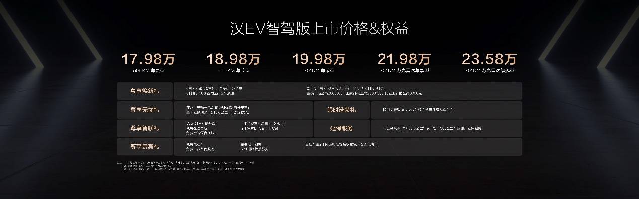 其中,汉DM-i智驾版共推出5款车型,售价16.88万~22.58万元;汉EV智驾版共推出5款车型,售价17.98万~23.58万元,开创B+C级轿车全民智驾,加配不加价!