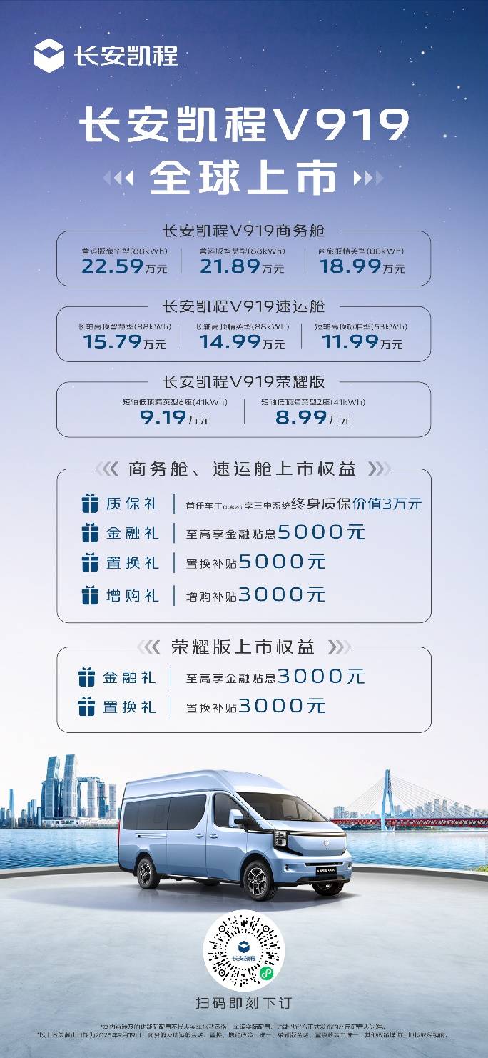 6月26日,“陆地航班﹒V你而来 —— 长安凯程V919全球上市发布会”在重庆举行。全球首款纯电动后驱宽体轻客、首款K01架构商用车型、首款新央企数智商用车、首款接轨乘用车体验轻客——长安凯程V919,以“四大首发”实力强势上市,凭“陆地航班”之空间和舒适度,颠覆燃油轻客市场,售价为8.99-22.59万元,为新世代生意人带来全新的“低能耗、大收益”解决方案及智慧物流新生态。