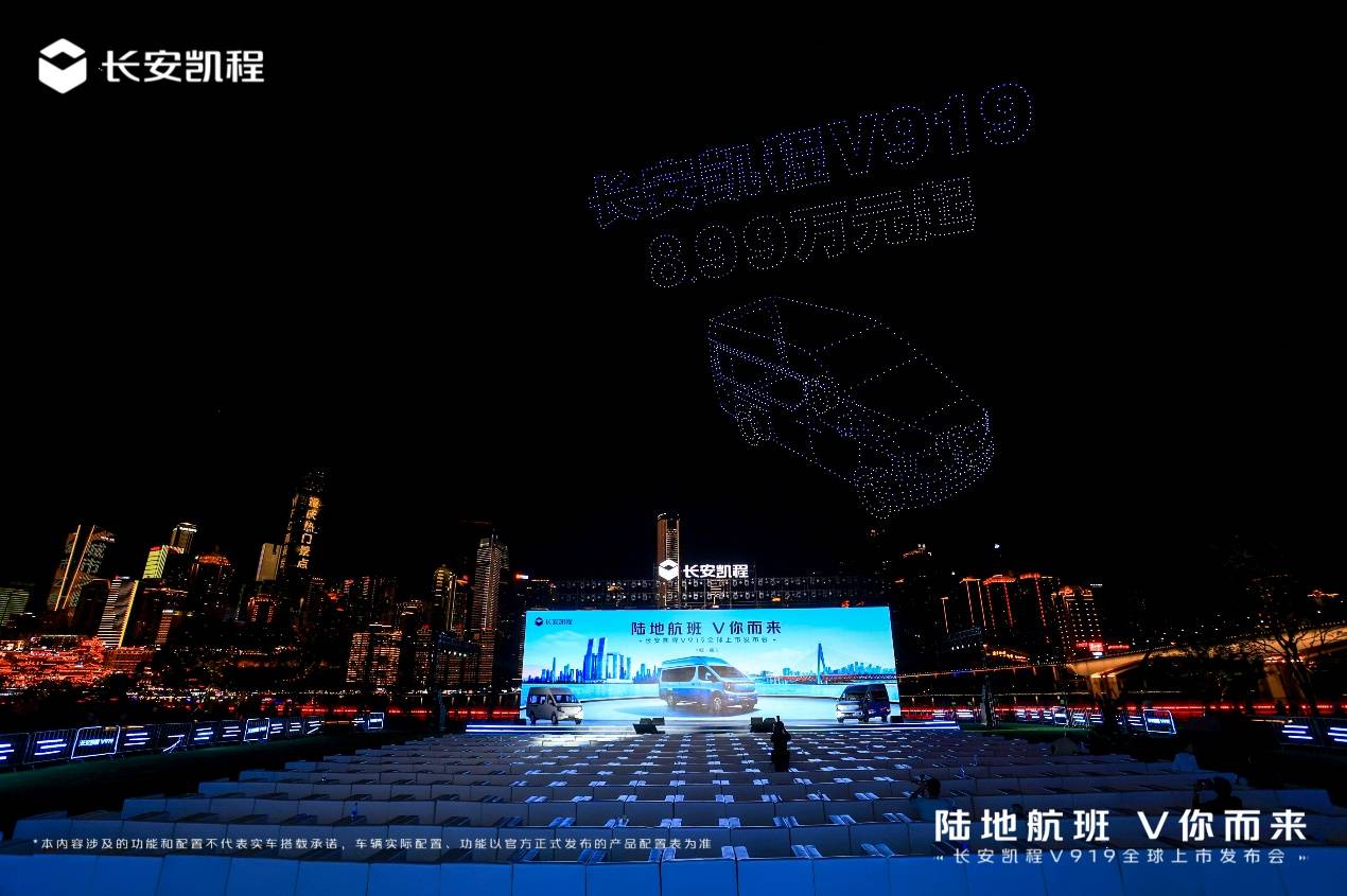 精彩震撼的无人机表演点亮夜空,与山城魅力交相辉映,V919承载着长安凯程战略转型的使命与万千消费者的创富热情,与用户扬帆启航。