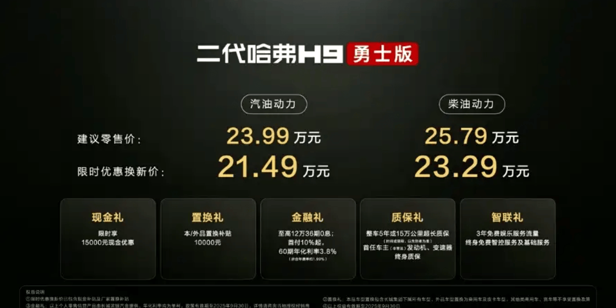 8月26日,哈弗H9勇士版正式上市。新车共推出2款车型,涵盖2.0T汽油版与2.4T柴油版,官方指导价处于23.99 - 25.79万元区间,而限时优惠换新价则低至21.49 - 23.29万元,作为新增车型版本,勇士版在多个维度进行了升级,更具强越野与个性化色彩。