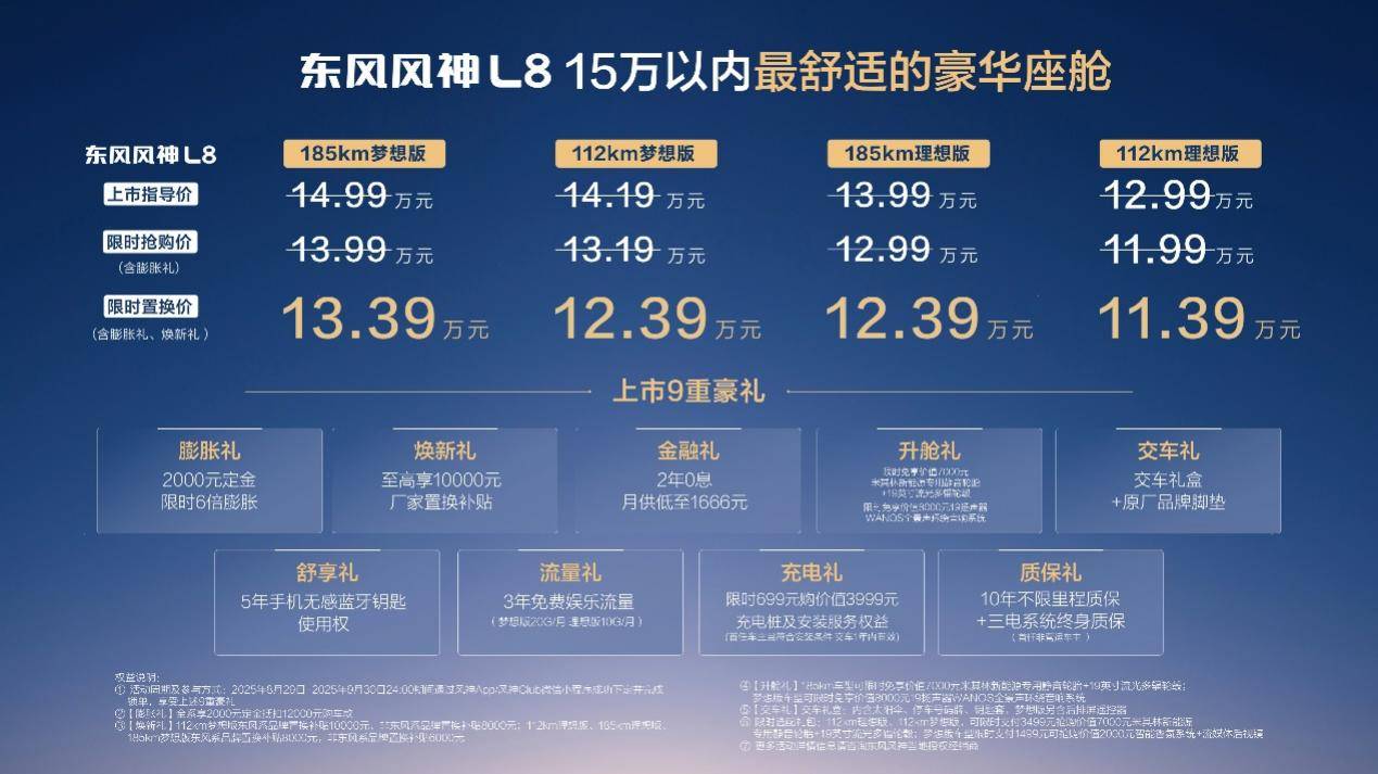 今天,东风风神在成都车展正式推出了旗下新旗舰车型 —东风风神L8。官方指导价区间为12.99-14.99万元,限时售价为11.99-13.99万元,限时置换价仅需11.39万元起。作为品牌新旗舰车型,东风风神L8不仅丰富了东风风神的产品线,在空间、配置、动力等方面都展现很强的竞争力。