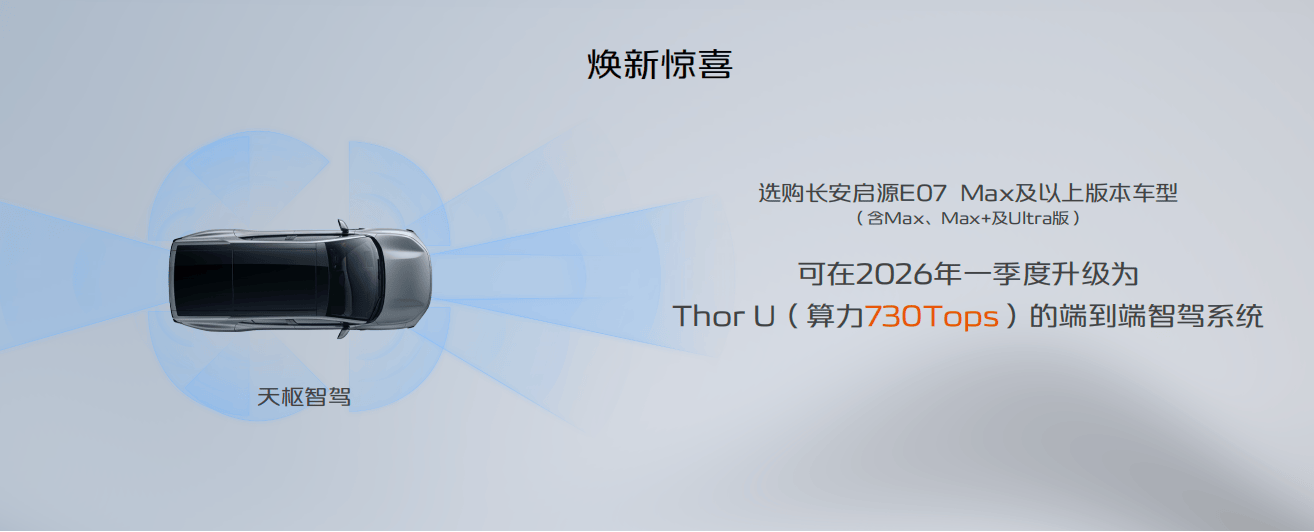 在智能驾驶辅助方面,基于长安汽车全栈自研的SDA天枢架构的 “硬件可插拔” 能力,Max及以上版本车型(含Max、Max+及Ultra版)预计在2026年一季度升级搭载高算力Thor U(算力730Tops)的端到端智驾辅助系统,城区智驾体验将更智能、安全。