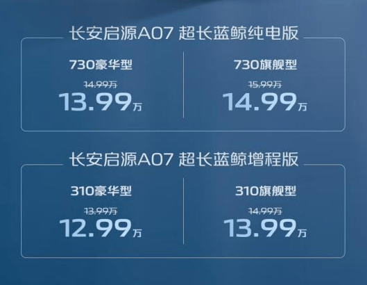 9月10日,长安启源A07超长蓝鲸纯电版/增程版正式上市。新车共推出4款车型,售价区间为12.99-14.99万元。作为增配车型,新车主要针对续航、座舱和辅助驾驶进行升级,其中增程版CLTC纯电续航提升至310km,纯电版CLTC纯电续航730km,并标配3C快充。此外,还搭载天枢驾驶辅助和启源OS 2.0智能座舱。那么,这款车的产品实力到底如何,下面我们就来详细解读一下。