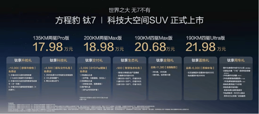 2025年新能源SUV市场的激烈角逐中,18-22万元价格带已成为车企必争的核心战场。据中国汽车流通协会数据,该区间车型占 15 -30 万元SUV 市场总量的 76%,聚集了小鹏 G7、吉利银河M9等十余款重磅产品,竞争从单纯价格战转向 “技术平权” 的价值重构。在此背景下,方程豹品牌推出的钛7以 17.98 - 21.98万元的精准定价入市,配合最高超 3.6 万元的上市权益,在中大型家用SUV领域构建起新的价值坐标系。作为钛系列第二款车型,该车延续品牌 “野性与科技”的基因图谱,却通过承载式车身设计和插电混动系统完成向城市家用场景的战略转向,这种定位差异使其既区别于豹系列的硬派越野属性,又以“大五座天花板”的产品姿态,将前双叉臂悬架、激光雷达等以往高端车型专属配置带入主流消费市场。