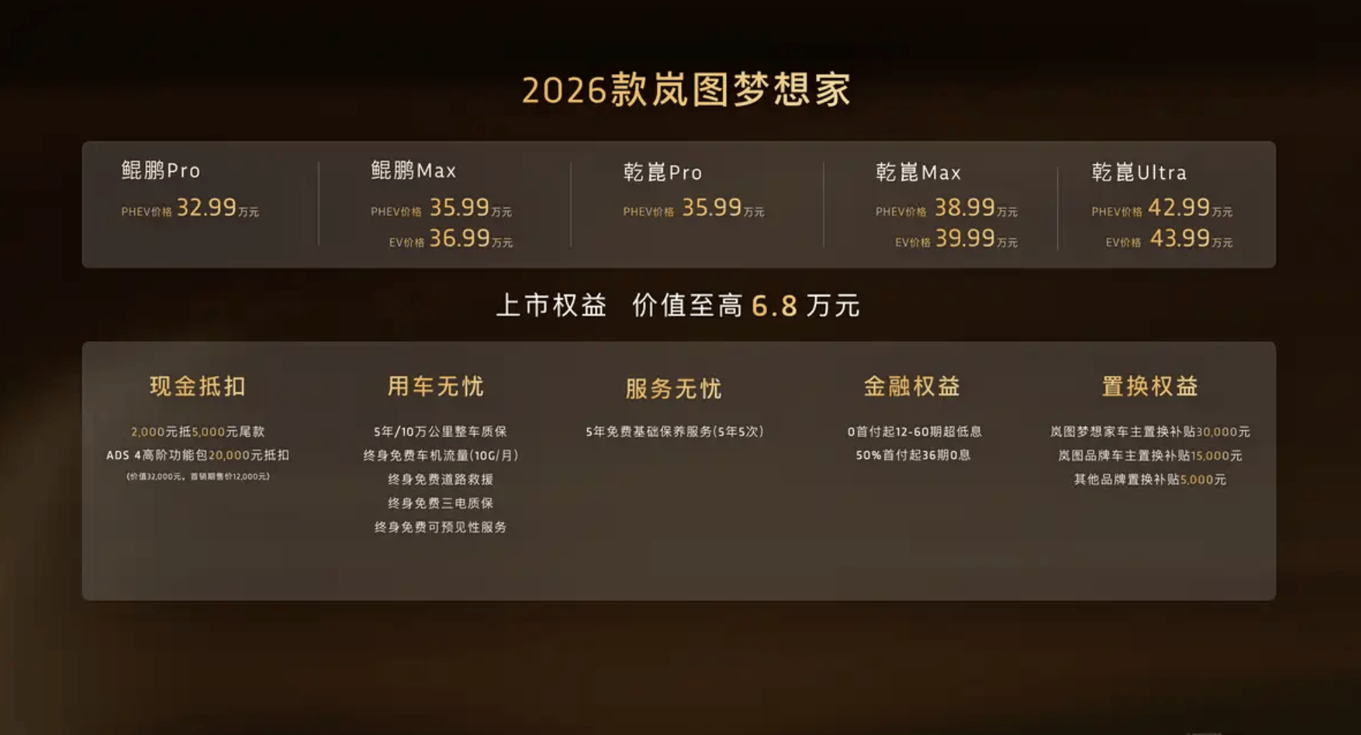 从价格体系来看,2026款梦想家32.99-43.99万元的定价区间精准覆盖中高端MPV市场。其中插电混动版本起售价32.99万元(鲲鹏 Pro PHEV),纯电版本起售价36.99万元(鲲鹏 Max EV),顶配车型为43.99万元的乾昆 Ultra PHEV 版本。这一定位使其与腾势D9(33.98-60.06万元)形成直接竞争关系,同时相比别克GL8等传统燃油MPV展现出新能源技术优势。