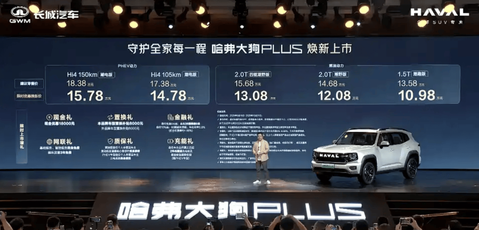 近日,哈弗大狗PLUS正式上市,作为二代大狗的改款车型,新车延续了“3/4刻度家庭座驾”的定位,提供燃油版与PHEV版共5款配置,官方指导价区间为13.58-18.38万元,限时优惠换新价降至10.98-15.78万元,优惠政策截止到2025 年10月31日。这一价格区间使其与长安CS75 PLUS、吉利星越L等车型形成直接竞争,同时10.98万元的起售价相比同价位合资品牌低配车型更具配置优势。