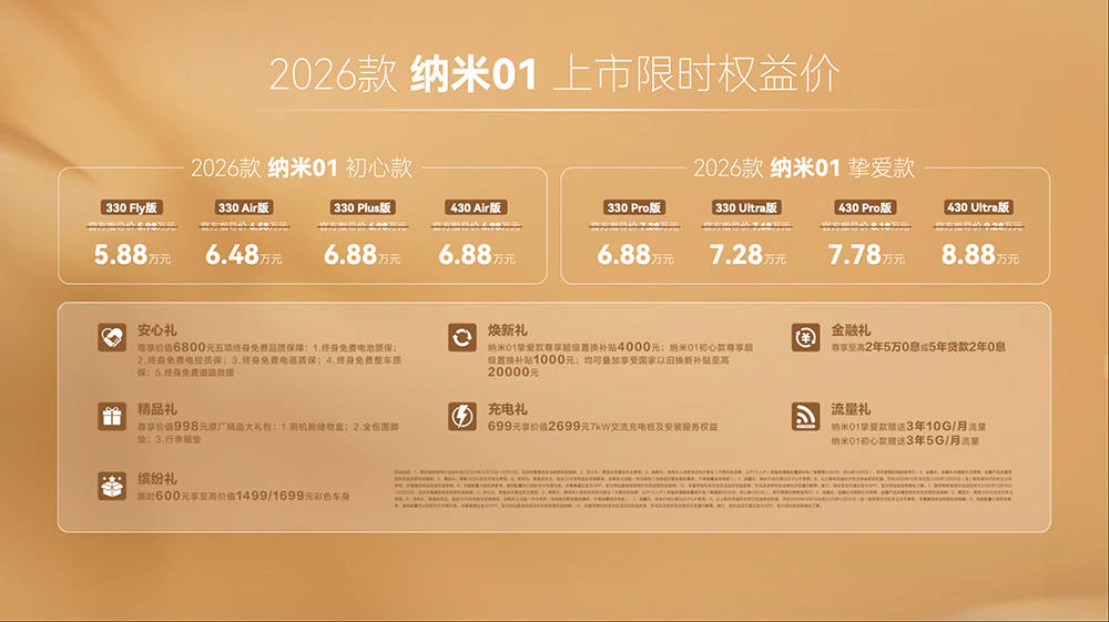 2026款纳米01的车身采用65%高强钢材质,配备6安全气囊与线控制动WCBS系统,延续了该车型此前 “中国汽车质量奖” 级别的安全标准。车辆的舒感空调新增ECO模式,可进一步优化能耗;其配备的云柔环抱座椅通过双硬度发泡工艺,平衡了座椅的支撑性与透气性。此次2026款纳米01共推出8款细分配置,限时指导价覆盖5.88万- 8.88万元区间。