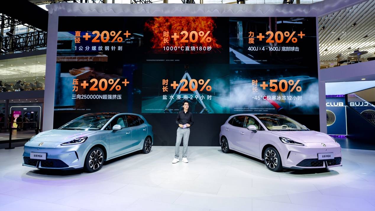 第23届广州车展上,MG全新MG4半固态安芯版的亮相,终结了半固态电池 “只谈概念不谈量产” 的行业常态。这款将于12月交付的车型,通过中汽中心六大极限测试验证 —— 螺纹钢穿刺测试模拟车辆碰撞后电池被异物穿透的极端场景,高温火烧测试还原夏季车辆暴晒或电路短路引发的火情风险,最终安全性能较行业最高标准提升20%以上,用实测数据标注出技术落地的清晰坐标。
