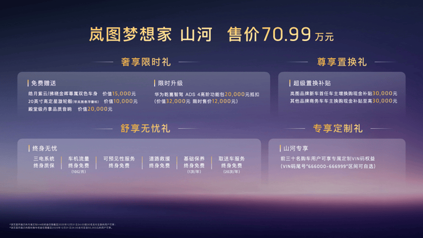 山河版的推出,是岚图在 35 万元以上 MPV 市场的再进阶。此前该区间长期由进口车型主导,而岚图凭借梦想家系列已实现份额突破,其 84.2% 的用户净推荐值(NPS)远超行业平均水平。70.99 万元的定价,并非盲目冲高,而是基于配置升级的合理溢价 —— 对比同级别竞品,其在智驾、补能、定制化方面的组合优势显著。